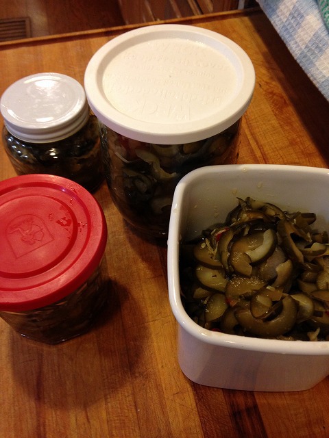 二日目の夜、胡瓜の種を取り、薄切りにして、水気を二回ほど絞る。調味料としょうがタカの爪を鍋にいいれ、グラットきたら胡瓜を入れて二分したらガスを切る