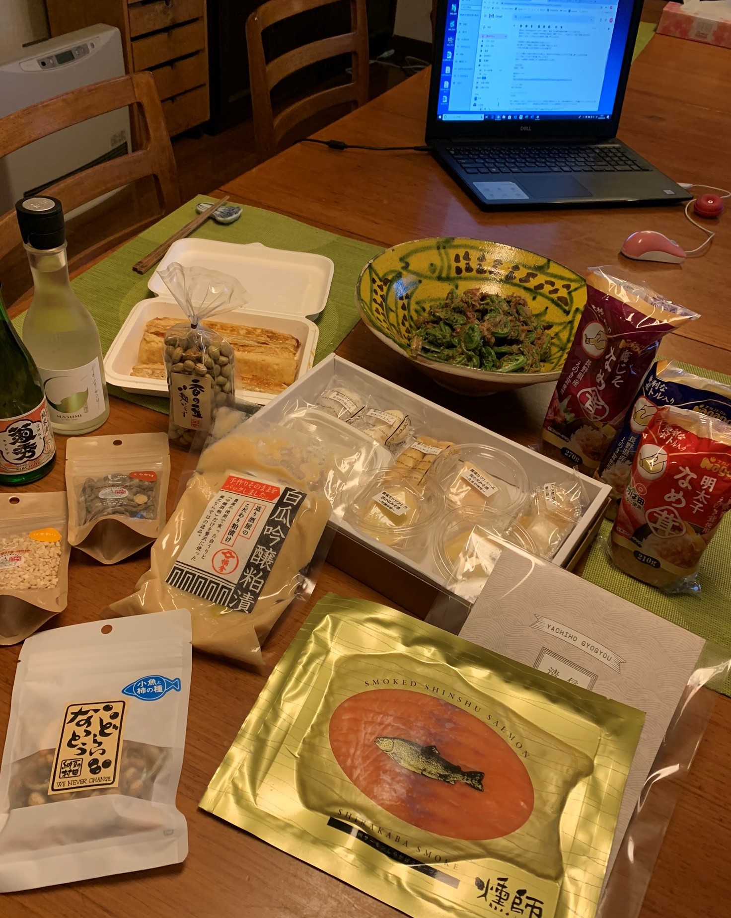 各社からご自慢の商品が送られてきた肴、一緒のものをつまんでのオンライン呑み会となりました。